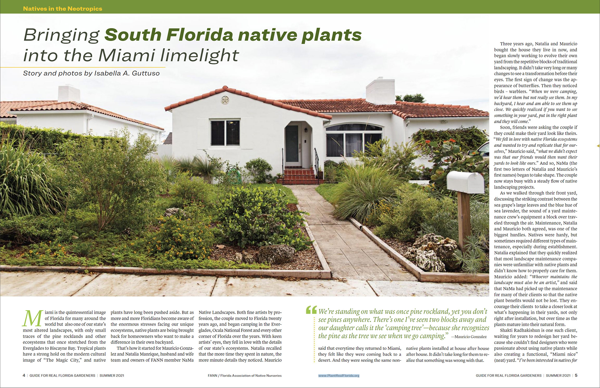 After winning the Real Florida Design Challenge, FANN hired Isabella as their first photojournalist to find stories about nursery growers, landscape architects or designers and homeowners who focus on Florida native plant use. The goal of story distribution is to inspire and provide information about opportunities within the native plant industry. Isabella also travels Florida photographing native landscapes for FANN's social media, publications and organizations, such as The Guide for Real Florida Gardeners and the Native Plant Horticulture Foundation.
